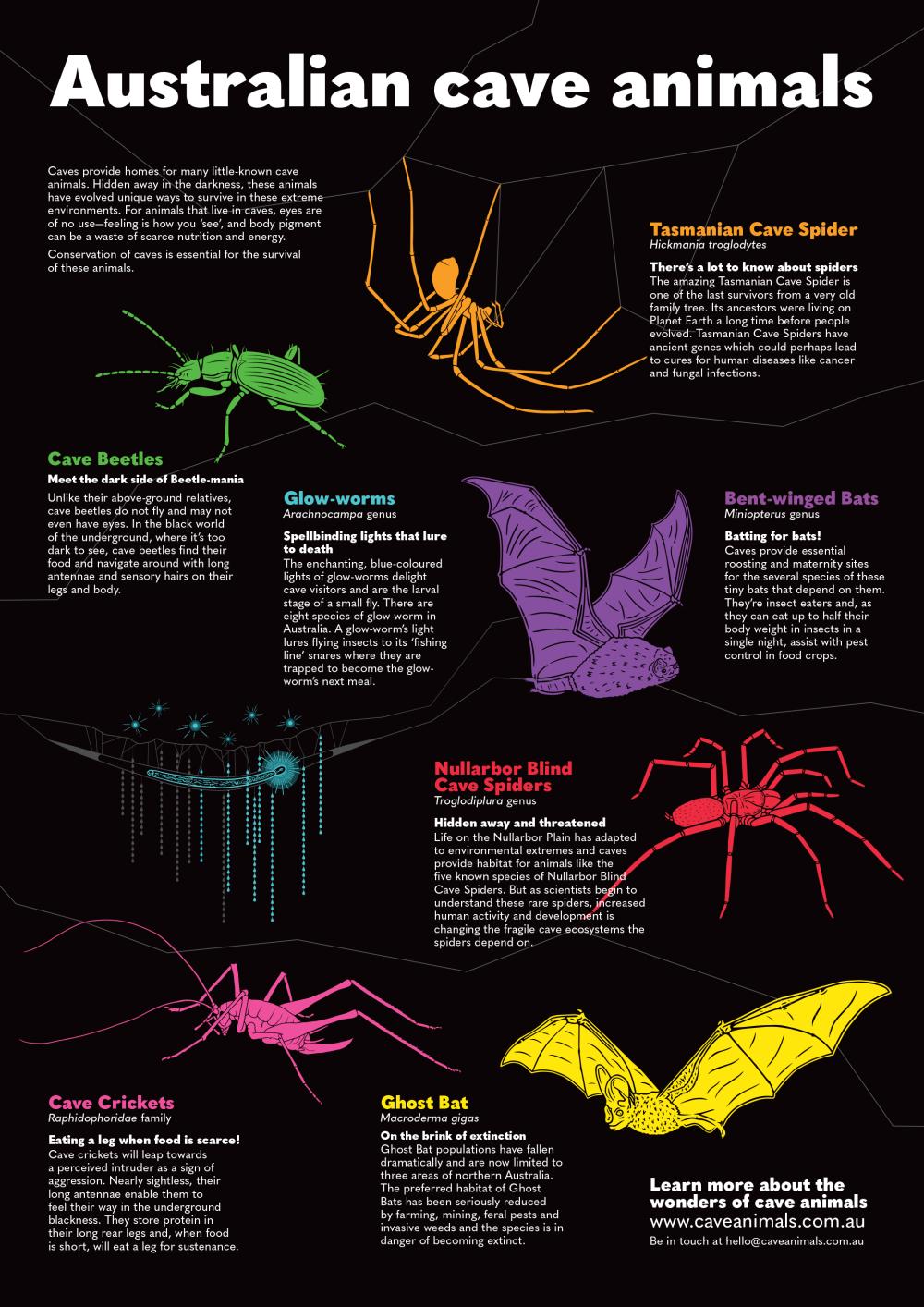 Six beautiful A3-sized posters were produced for the Cave Animal of the Year program in 2019 to 2024. These feature Tasmanian cave spider, cave crickets, cave beetles, ghost bat, glow-worms and the Nullarbor blind cave spider.